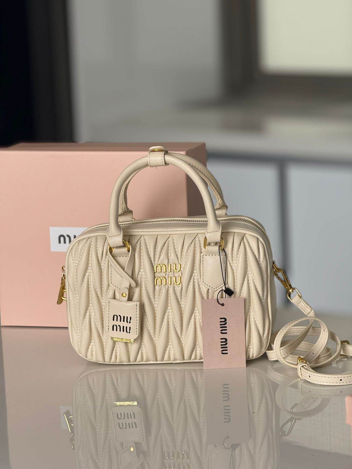 IMPORTADO 1.1 Bolso femenino color CREMA/BEIGE tamaño pequeño diseño acolchado y acabados elegantes. Cuenta con logo MIU MIU dorado, herrajes metálicos y doble uso: asas de mano y correa larga ajustable. Se presenta con caja y etiquetas, ideal para un estilo moderno y sofisticado.